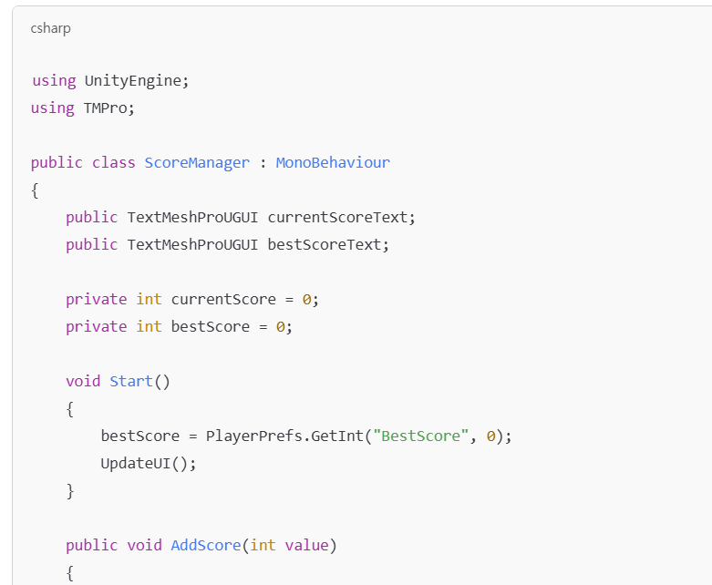 - 예시: TargetCollision.cs에서 점수 업데이트를 아래처럼 수정