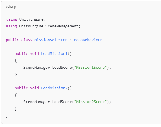 - 각 버튼 클릭 시 단계별 미션 씬 또는 기능 연결