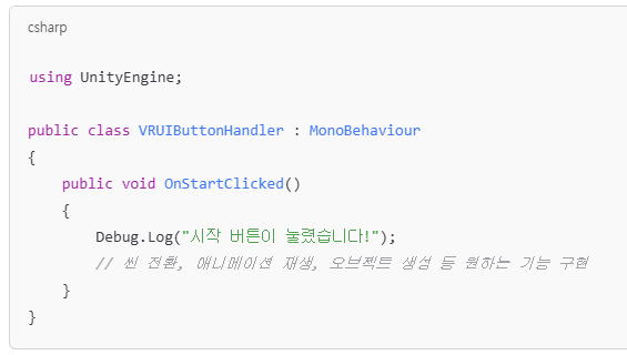 ✅ 버튼 클릭 시 반응하는 public void OnStartClicked() 함수는 뒤에서 연결